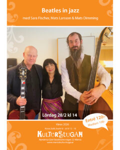 28 februari kl 14 Musik Beatles in jazz Sara Fischer, Mats Larsson och Mats Dimming